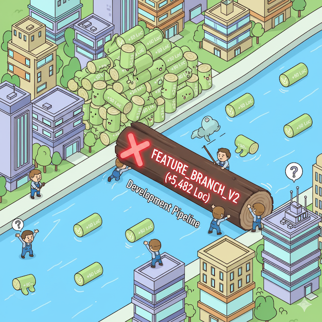 This same principle translates to software development through a practice called trunk-based development. The core idea: disallow long-lived feature branches, minimize work-in-progress, and limit pull requests to small, reviewable chunks.